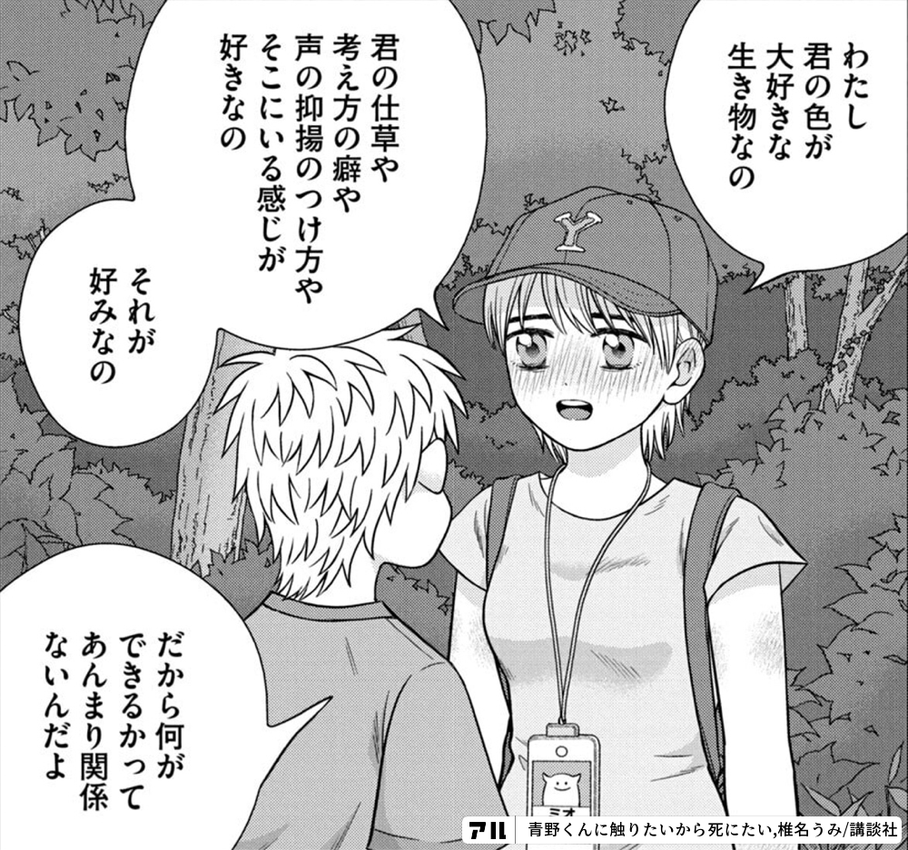 わたし君の色が一大好きな生き物なの君の仕草や考え方の癖や声の抑揚のつけ方や一そこにいる感じが好きなのだから何ができるかってあんまり関係ないんだよそれが好みなの 青野くんに触りたいから死にたい アル